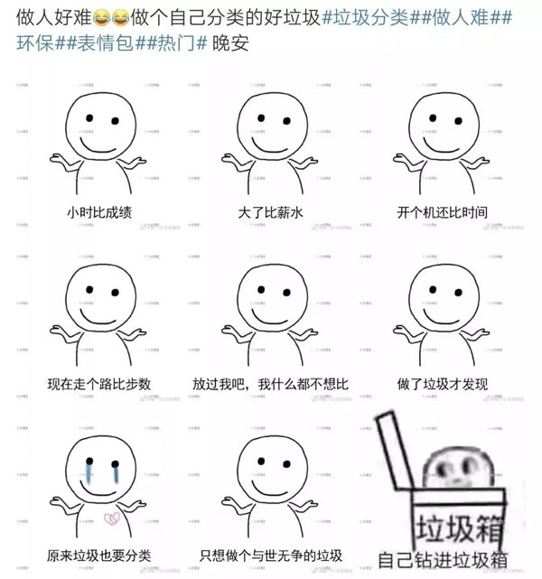 有人感嘆,做人好難啊,小時候比成績,長大了比薪水,電腦開機比時間,走路比步數(shù),安心做個垃圾吧,發(fā)現(xiàn)原來垃圾也要分類……