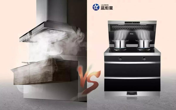 ▲傳統(tǒng)油煙機vs藍炬星集成灶側(cè)吸下排